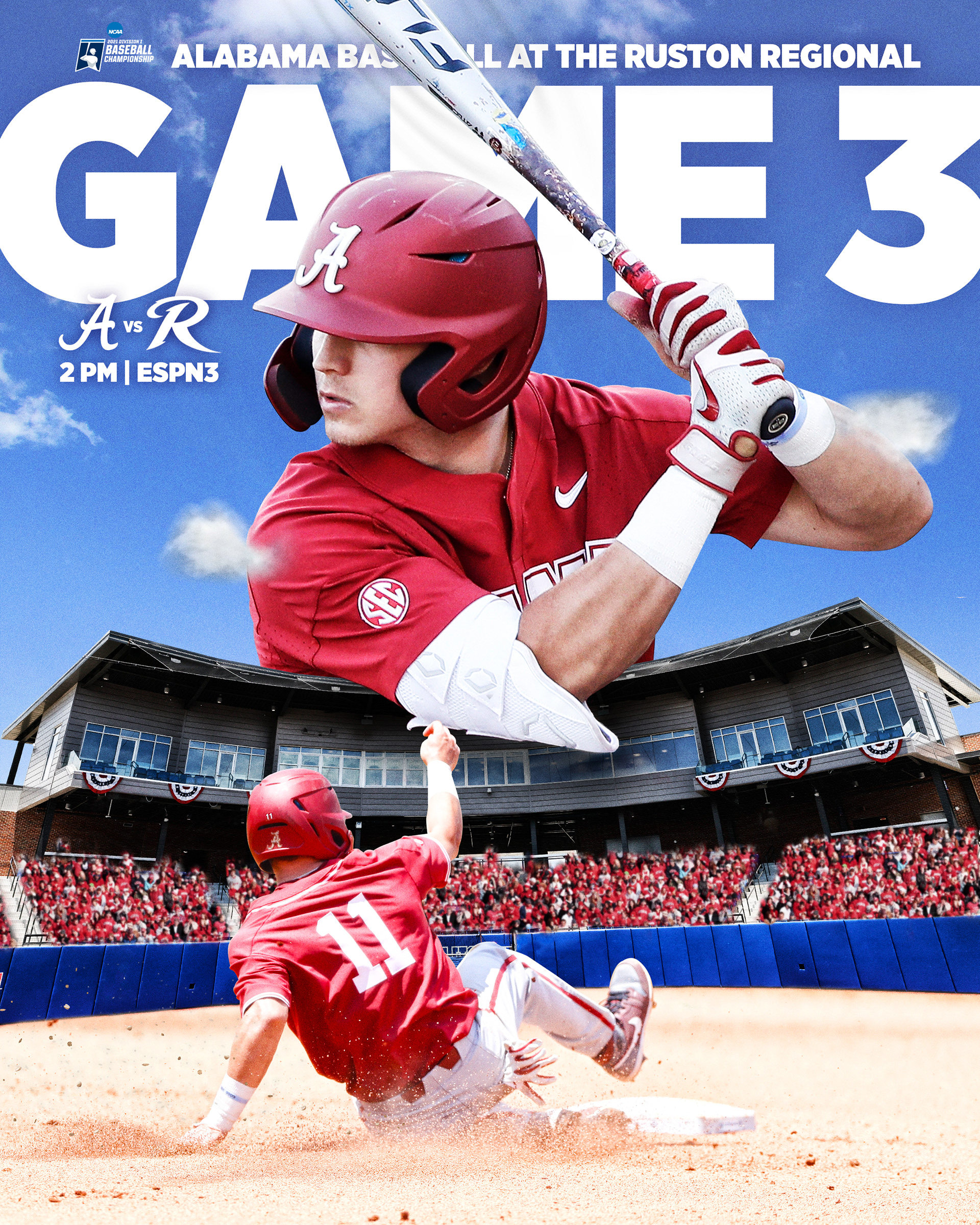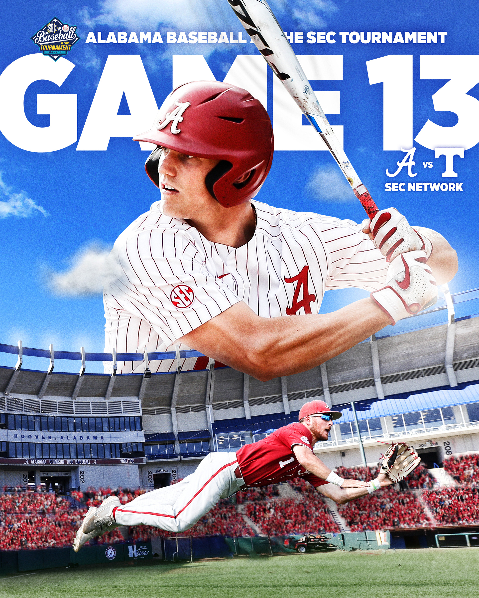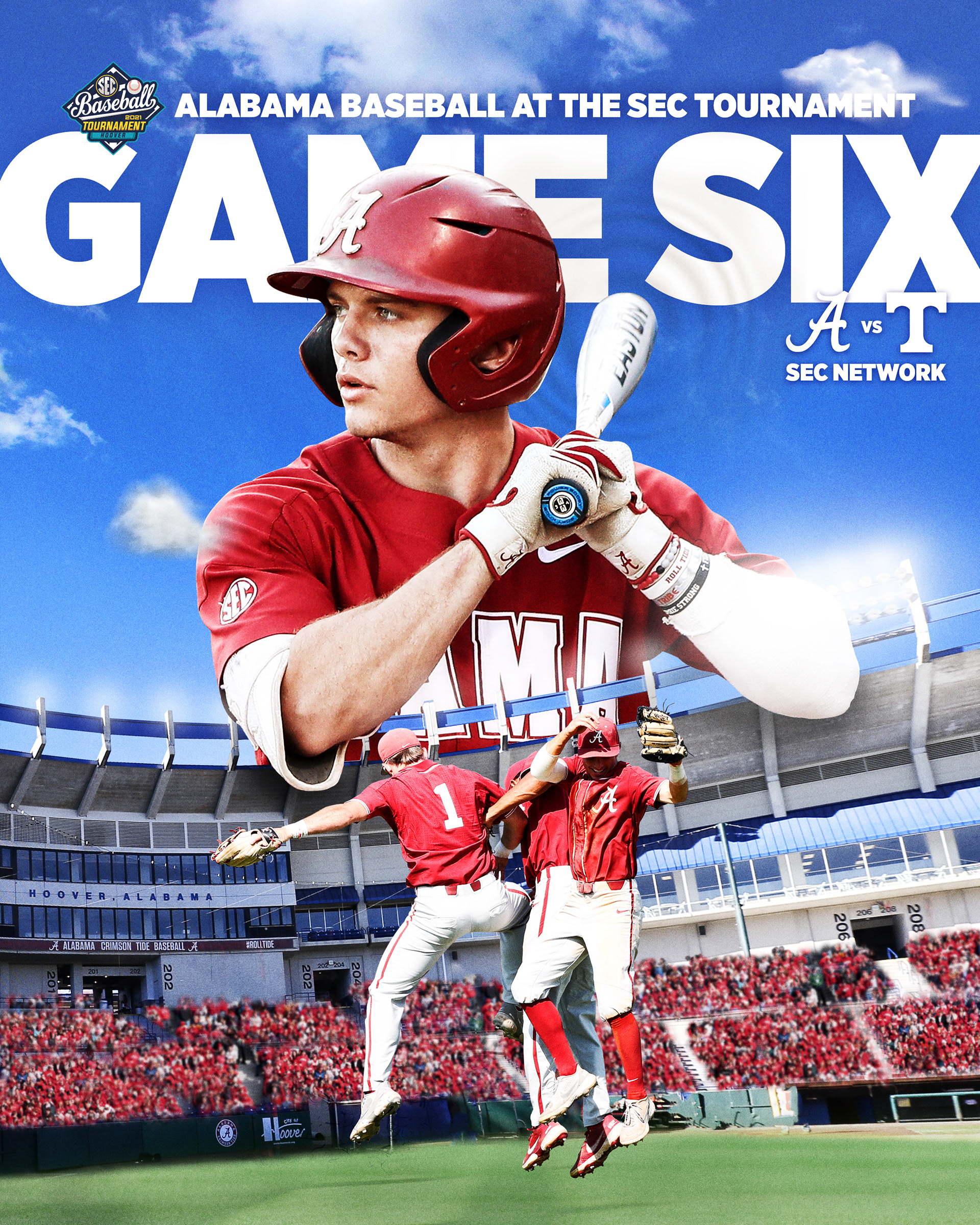 Alabama Baseball postseason graphics to advertise advancement in tournament, opponent and television network. Posted to social media before each game.