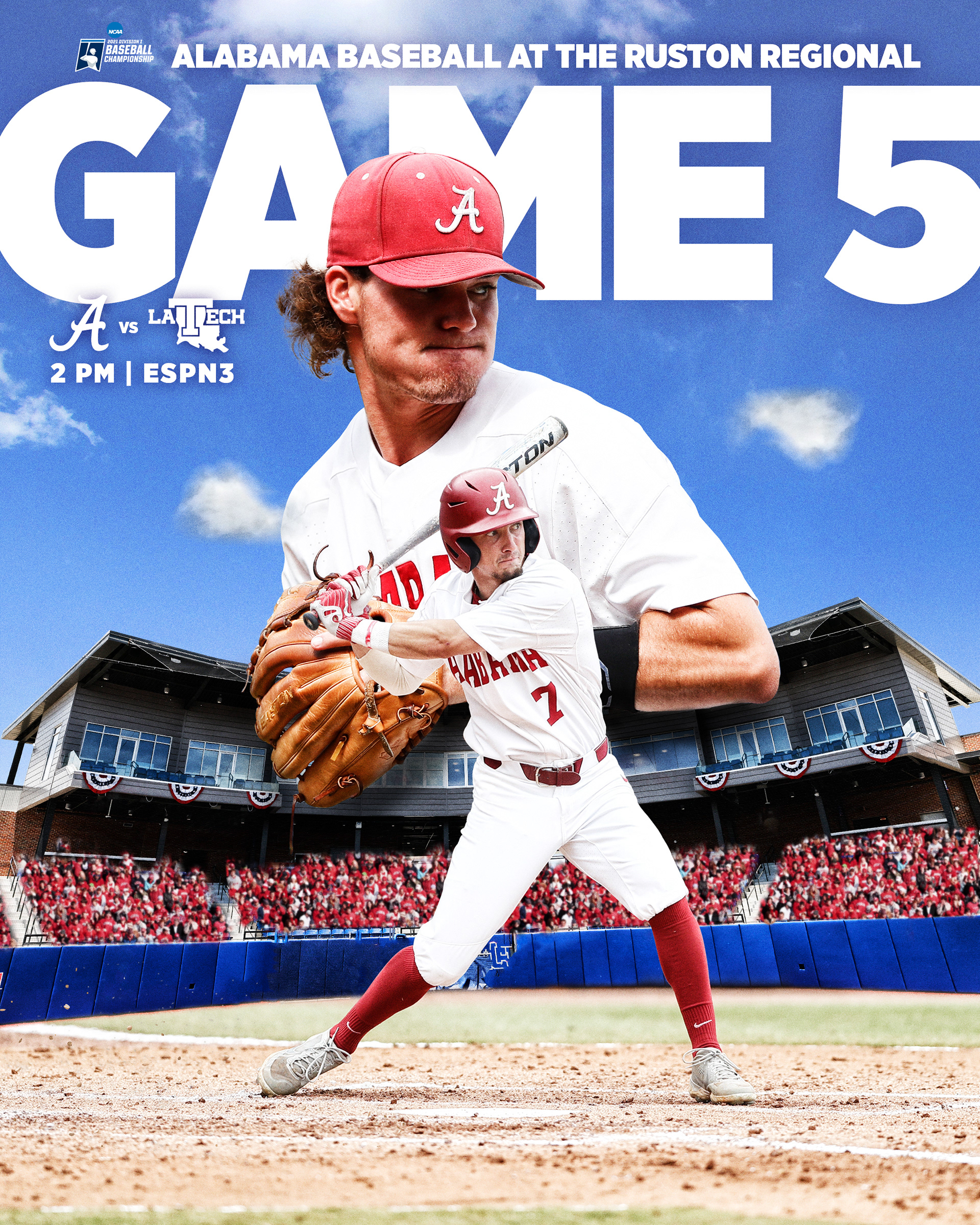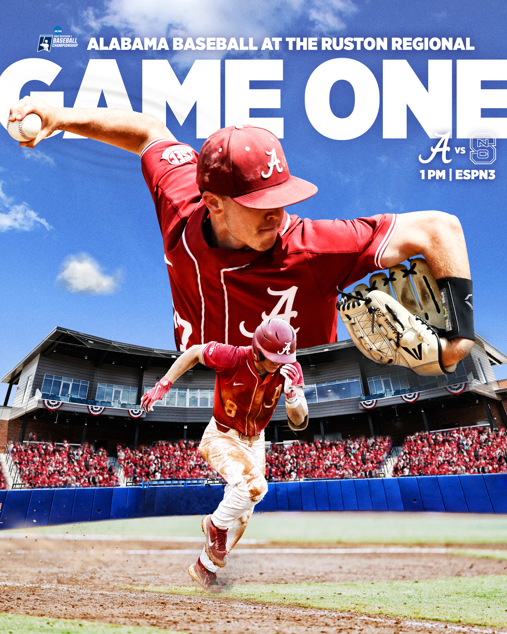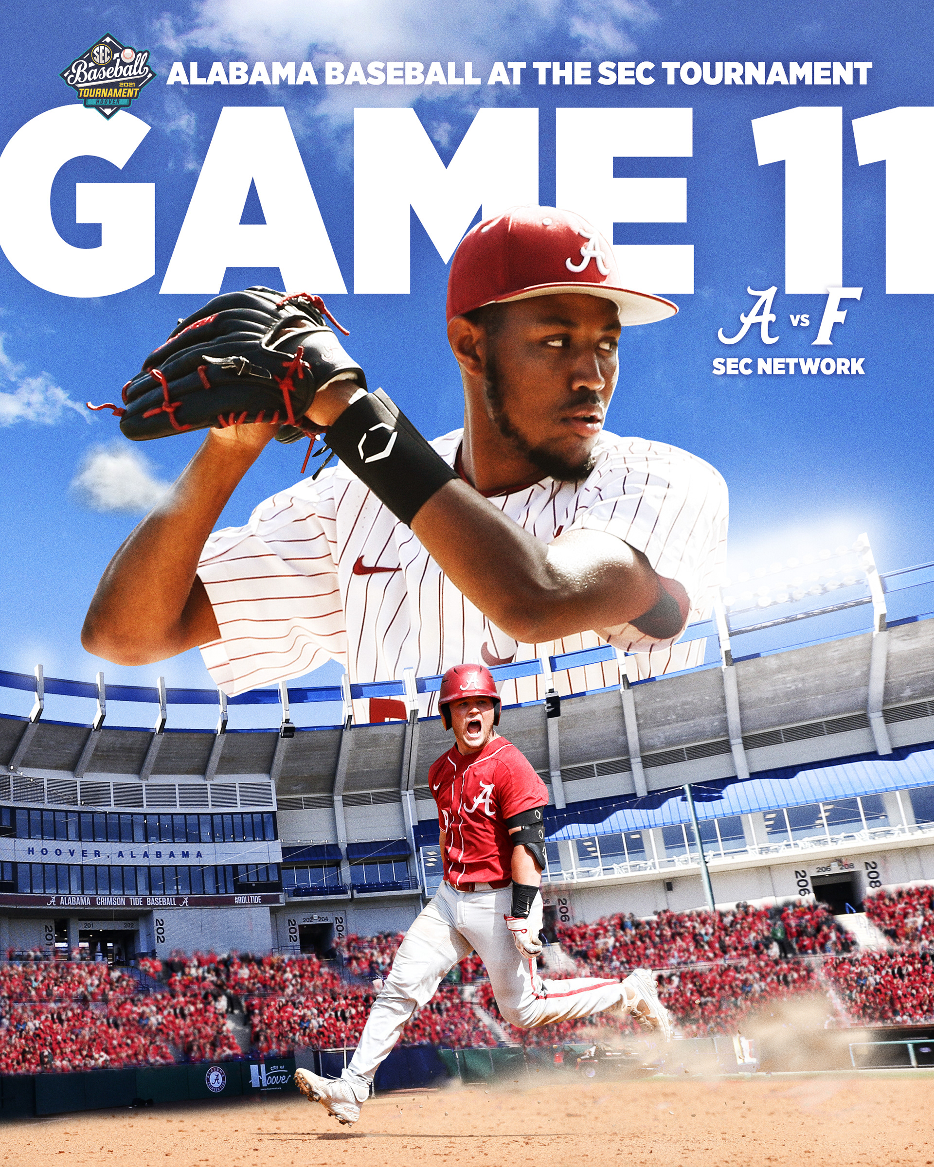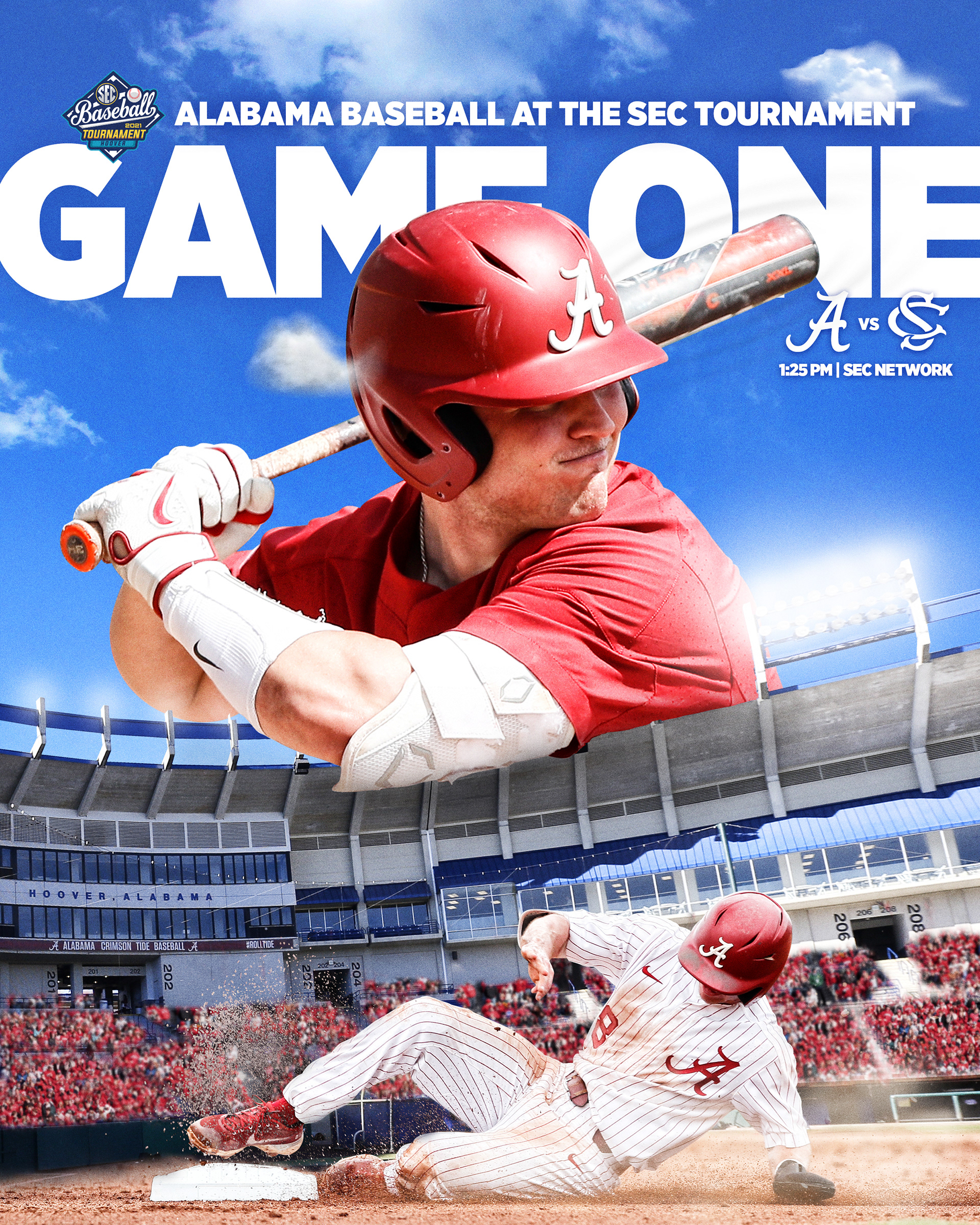 Alabama Baseball postseason graphics to advertise advancement in tournament, opponent and television network. Posted to social media before each game.