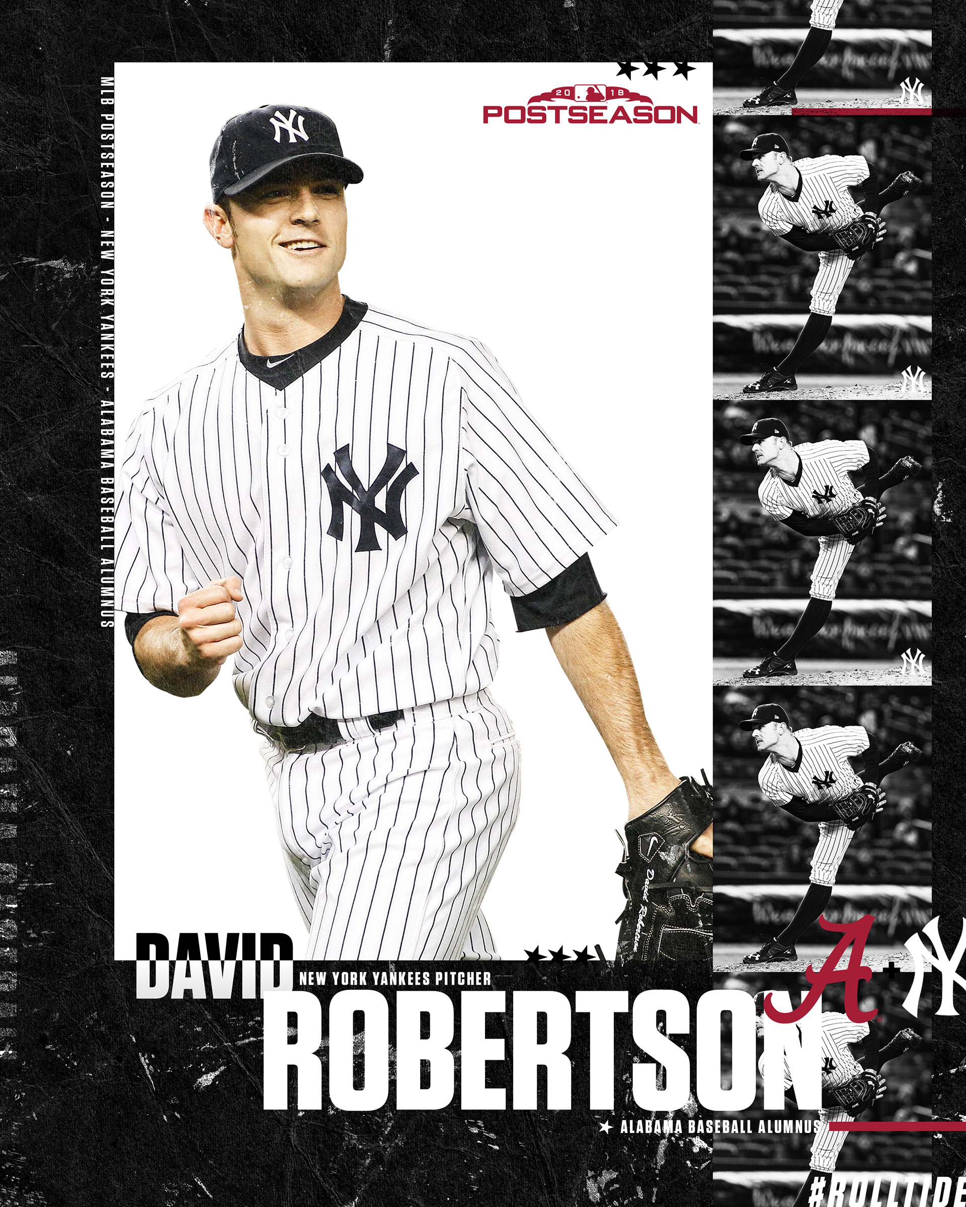 Social media graphic to highlight David Robertson - Alabama Baseball alumnus in the MLB Postseason run with the Yankees. Fall 2018.